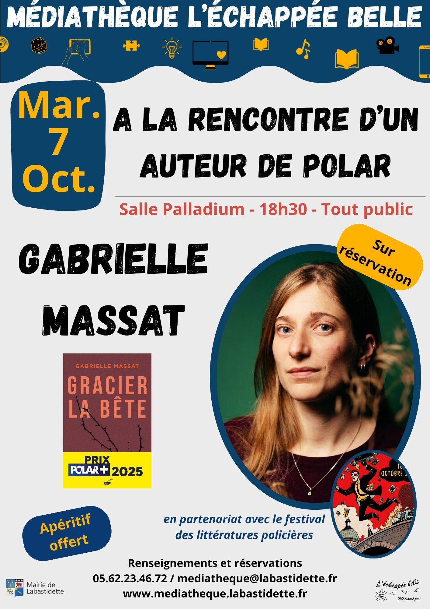 Nous avons le plaisir de vous annoncer une rencontre exceptionnelle avec Gabrielle Massat, auteure reconnue dans l’univers du polar ! 🖋️✨