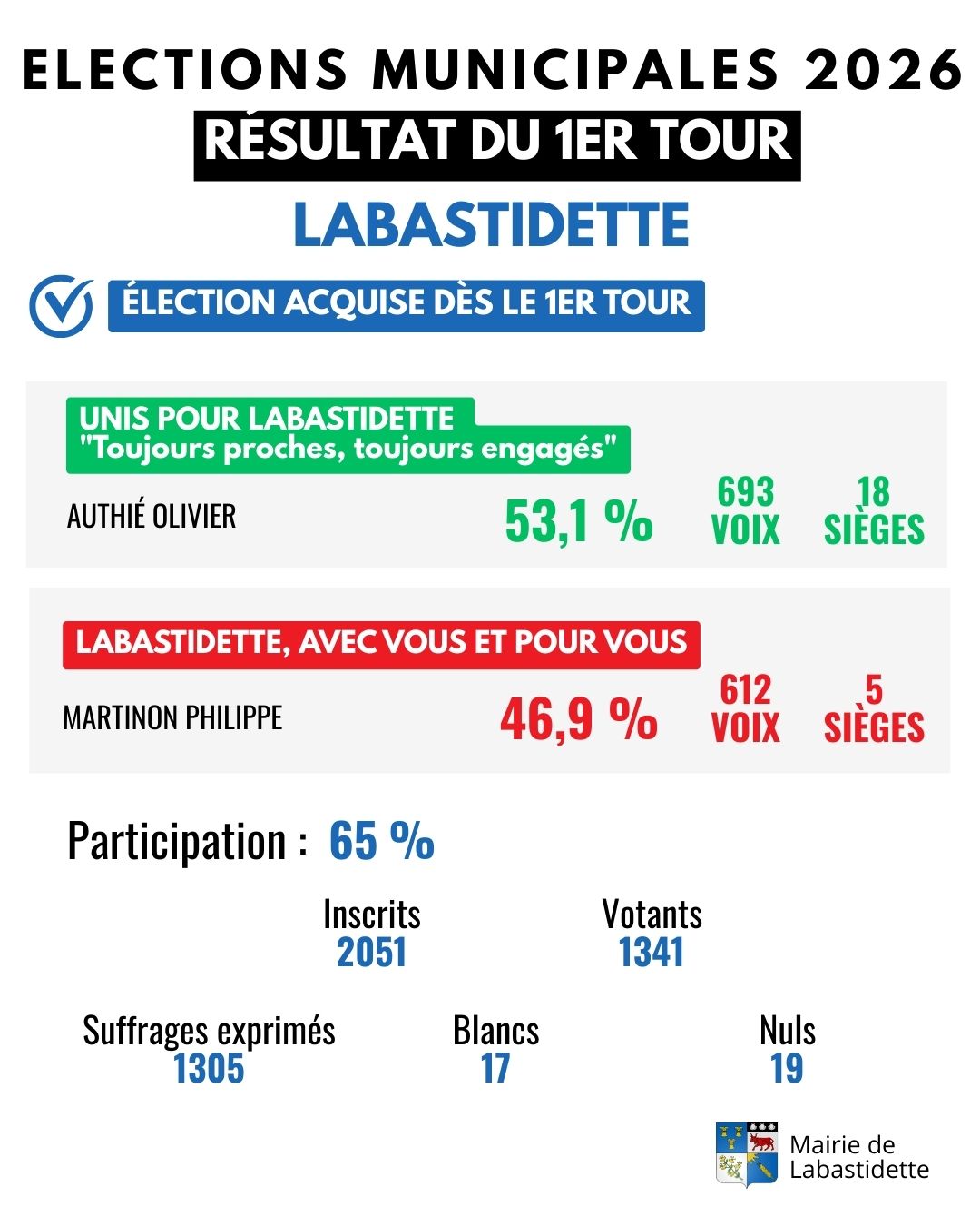 À l’issue du dépouillement, la liste « Unis pour Labastidette – Toujours proches, toujours engagés », conduite par Olivier Authié, obtient la majorité absolue avec 53,1 % des suffrages exprimés.