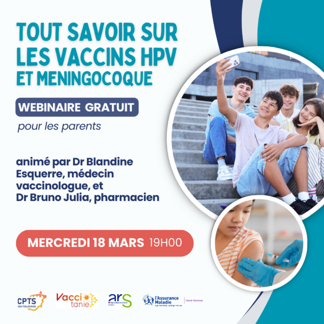 Dans le cadre de la campagne de vaccination HPV et Méningocoque qui a lieu dans les collèges du 9 mars au 18 avril, la CPTS du Sud Toulousain organise, pour la première fois, un webinaire gratuit à destination des parents d’élèves.